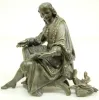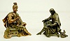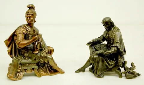 1.) Warrior with a feathered helmet, bugle, arrow and dressed in armor; copper finish. (Some paint and finish loss.) 2.) Long haired man in fancy clothing with robe, book and olive branch. (He has a crack in the back of his arm.) Tallest 8"
