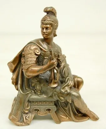 2 Seated Male Metal Clock Statues 1.) Warrior with a feathered helmet, bugle, arrow and dressed in armor; copper finish. (Some paint and finish loss.) 2.) Long haired man in fancy clothing with robe, book and olive branch. (He has a crack in the back of his arm.) Tallest 8"