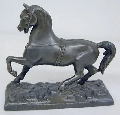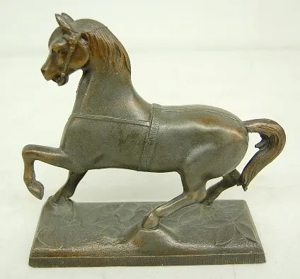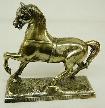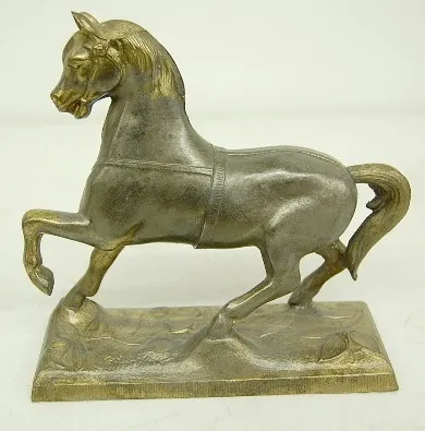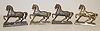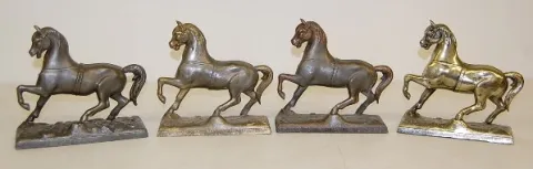 all with molded harnesses; high stepping pose; molded leaves and flowers on the base; 1 each in bright gold finish; silver/gold finish; pewter finish and worn copper finish. Pewter finish horse does not have a hole behind its ear. 8" T x 9" L