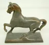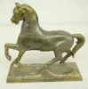 4 Prancing Horse Metal Clock Statues all with molded harnesses; high stepping pose; molded leaves and flowers on the base; 1 each in bright gold finish; silver/gold finish; pewter finish and worn copper finish. Pewter finish horse does not have a hole behind its ear. 8" T x 9" L