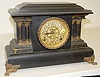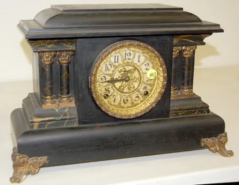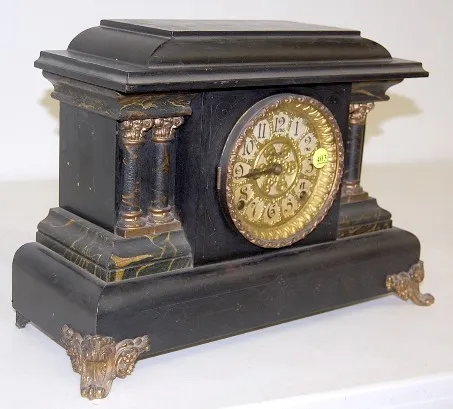 Black Enamel Marbleized Mantle Clock time and strike; hour gong and half hour bell strike; 4 1/2" unmarked paper dial under fancy metal dial; no key or pendulum; black enamel with marbleized columns and trim; cast metal trim and feet; not tested for running condition. (Dial yellowed.) 12"