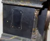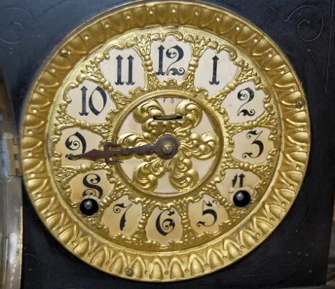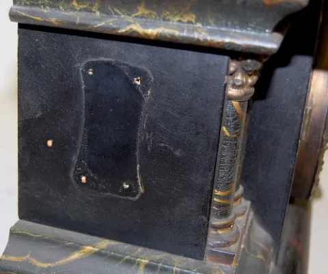 time and strike; hour gong and half hour bell strike; 4 1/2" unmarked paper dial under fancy metal dial; no key or pendulum; black enamel with marbleized columns and trim; cast metal trim and feet; not tested for running condition. (Dial yellowed.) 12"