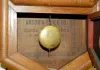 time only; 11 1/2" marked paper dial on tin; has pendulum; no key; good interior label; gilt decorated lower door. (Dial discolored.) 24 1/2"...