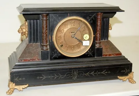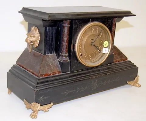Adamantine Enameled Wood Clock time and strike; gong strike; 4 1/2" metal dial; has pendulum; no key; adamantine columns and side with cast metal lion heads and paw feet; unmarked movement. (Winds, but does not run; gong sounds flat; dial held on by one screw; new screws and plate on back of clock; mar to top of case.) 11"