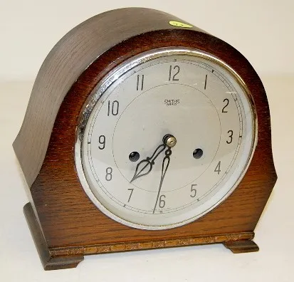 1.) Smiths Enfield Wood Mantle Clock: 8 day time and strike; hour and half hour strike; 5 1/2" marked metal dial; marked movement; has pendulum. (Does...