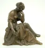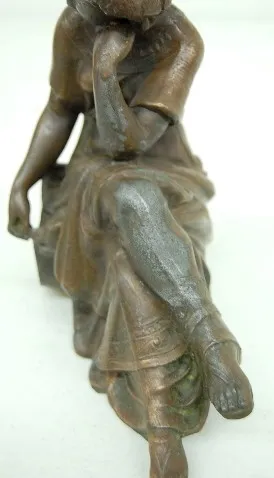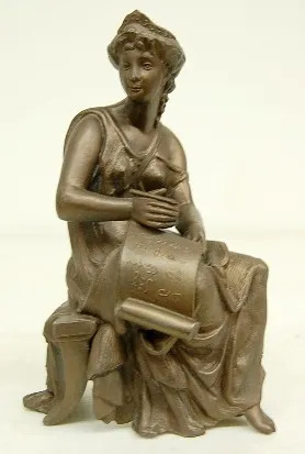2 Seated Women Metal Clock Statues 1.) Lady sitting w/ elbow on knee, holding lyre. 8 1/2" T 2.) Lady sitting, writing on tablet. 9" T