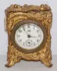 2 Antique Metal Dresser Clocks 1.) Jennings Brothers floral carriage clock; porcelain dial. 2.) New Haven w/ winged cherub and man's face. (Both wound tight.) 6" Tallest. This lot is in rough, as is, as found condition.