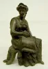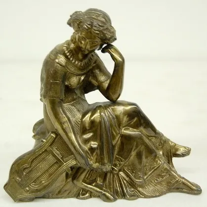 2 Seated Women Metal Clock Statues 2 Clock Statues: 1.) Female sitting w/ elbow on knee, holding a musical instrument. 2.) Female sitting w/ writing tool and tablet. Tallest 9" T