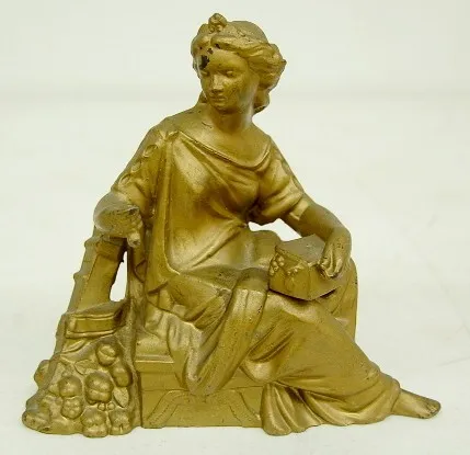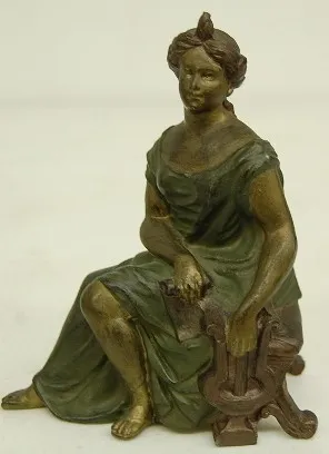 3 Seated Lady Metal Clock Statues 1.) Lady sitting w/ box on knee and quiver by her side. 6 3/4" 2.) Lady sitting holding musical harp. 6 1/2" 3.) Lady sitting holding bow, w/ quiver on her back. 6 1/2"