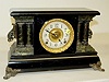time and hour gong, half hour bell strike; marked paper chapter ring; 4 1/2" dial; has pendulum; black enamel case with marbleized columns and trim; cast metal trim and feet. (Dial discolored; case mars.) 10 3/4"