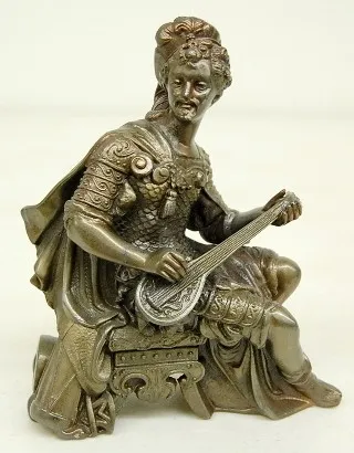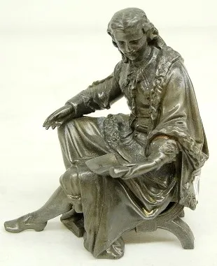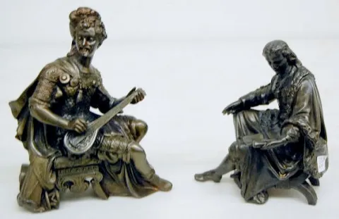 2 Seated Men Metal Clock Statues 1.) Man sitting on stool playing a mandolin. (Tip is cracked.). 7 1/2'T 2.) Man sitting reading tablet. 6 1/2"