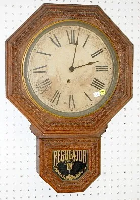 Pressed Oak Octagon Regulator B Short Drop Clock time only; 11 3/4" unmarked paper dial on tin; lower door painted "Regulator B"; has pendulum and key; not tested for running condition. (Dial discolored.) 25"