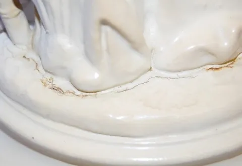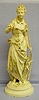 cream with gold highlights she is dressed in a blouse, skirt and shirtwaist; she is carrying a long pole possibly a fishing pole. (Some paint chips to fingers and around base.) 17"