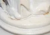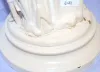 Period Dress Standing Woman Clock Statue cream with gold highlights she is dressed in a blouse, skirt and shirtwaist; she is carrying a long pole possibly a fishing pole. (Some paint chips to fingers and around base.) 17"