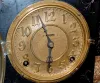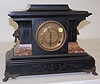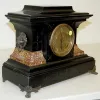 8 day time and strike; half hour and hour gong strike; 4 1/2" metal dial with raised numbers; has pendulum; no key; black enamel case with marbleized accents; cast metal lion heads and winged paw feet. (Some marring to case.) 12 3/4" and running at this time