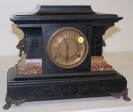 Enamel Marbleized Lion Head Mantle Clock 8 day time and strike; half hour and hour gong strike; 4 1/2" metal dial with raised numbers; has pendulum; no key; black enamel case with marbleized accents; cast metal lion heads and winged paw feet. (Some marring to case.) 12 3/4" and running at this time