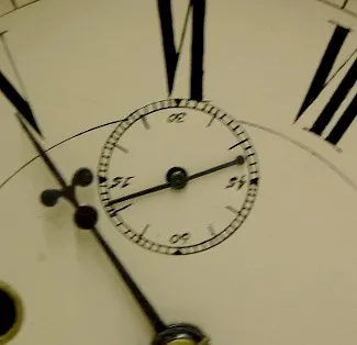 time only; 5 1/2" metal painted dial with seconds bit. (Note on back says dial repainted in 1970; small areas of loss to finish.) 8 1/2"