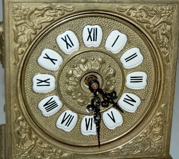 Ornate Brass Shelf Clock with cartouche numerals; Time Only. 9 1/2" This lot is in rough, as is, as found condition.