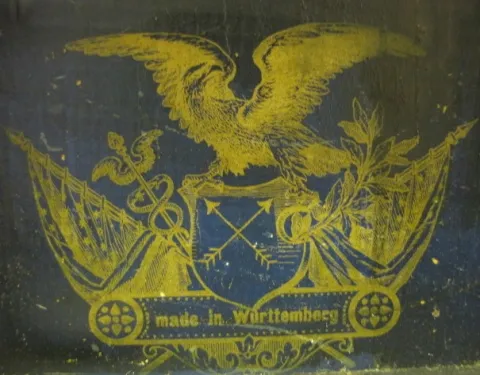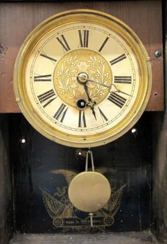 paper on metal dial; has pendulum; marked Made in Wurttemberg. Not tested. 15" T