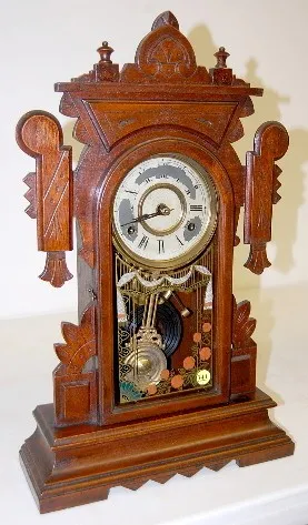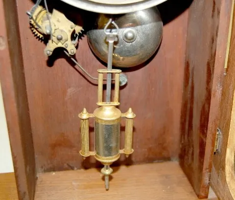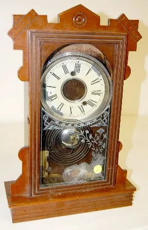 1.) Carved case; tin painted dial; time and strike; has pendulum; no key; floral and swag painted glass door. (Dial is rough.) 2.) Carved case; tin pa...