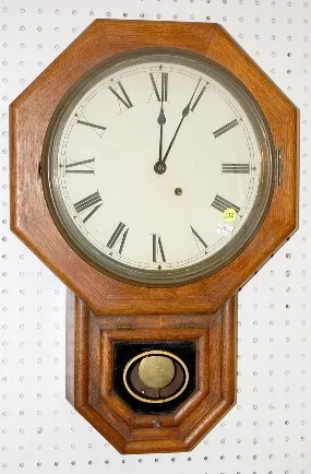 Antique Oak Octagon Short Drop Wall Clock time only; 12" unmarked paper dial; has pendulum and key; painted lower door; not tested for running condition. (Dial appears new.) 23 3/4"