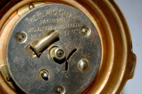 Plato Brass Digital Desk Clock . (Worn patina; loose screw inside.) 6" This lot is in rough, as is, as found condition.