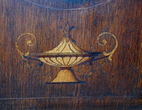 1.) New Haven Inlaid Round Top Mantle Clock: time and strike with hour and half hour gong strike; 4" marked porcelain dial; unmarked movement; has pen...