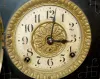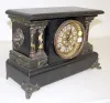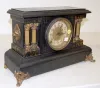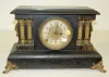 2 Mantle Clocks: Seth Thomas and E.N. Welch 1.) Seth Thomas Adamantine Mantle Clock: 8 day; time and strike; cathedral gong with half hour bell strike; 4 1/2" marked painted tin dial; has key and pendulum; black enamel with adamantine accents, faux onyx columns, cast metal lion heads and feet. (Dial discolored and loose; gong wants to but does not strike; slight roughness to case.) 11" 2.) E.N. Welch Marbleized Enamel Mantle Clock: 8 day; time and strike; cathedral gong with half hour bell strike; 4 1/2" unmarked paper dial; unmarked movement; no key or pendulum; black enamel with marbleized columns and accents; cast metal lion heads and feet; not tested for running condition. (Dial is discolored.) 11"