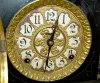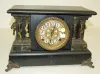 1.) Seth Thomas Adamantine Mantle Clock: 8 day; time and strike; cathedral gong with half hour bell strike; 4 1/2" marked painted tin dial; has key and pendulum; black enamel with adamantine accents, faux onyx columns, cast metal lion heads and feet. (Dial discolored and loose; gong wants to but does not strike; slight roughness to case.) 11" 2.) E.N. Welch Marbleized Enamel Mantle Clock: 8 day; time and strike; cathedral gong with half hour bell strike; 4 1/2" unmarked paper dial; unmarked movement; no key or pendulum; black enamel with marbleized columns and accents; cast metal lion heads and feet; not tested for running condition. (Dial is discolored.) 11"