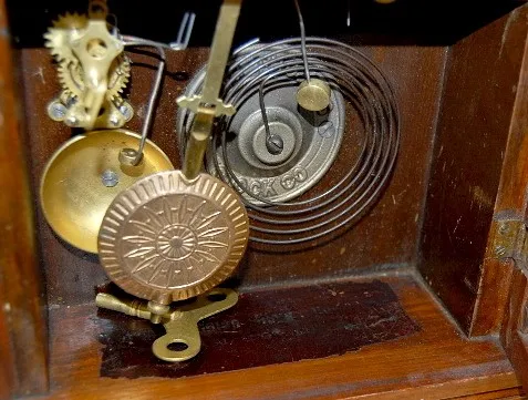 1.) Seth Thomas Walnut "Dover" Mantle Clock: 8 day; time and strike with alarm; half hour strike; 5" marked paper dial on tin; has key and pendulum; w...