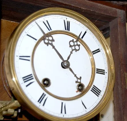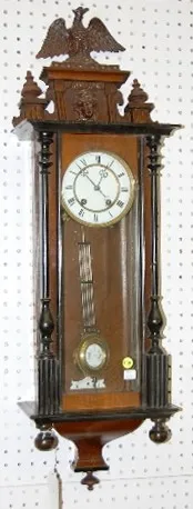 time and strike; has pendulum and key; 5 1/2" porcelain dial; two color case with eagle and lady head; not tested for running condition. (Some case we...