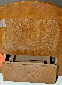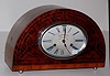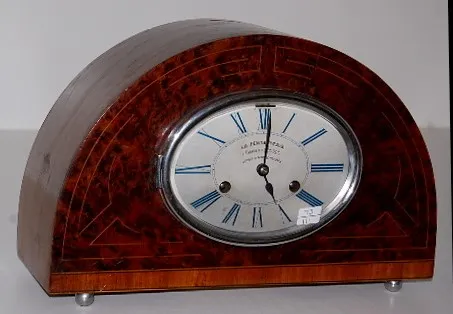 French Antique Art Deco Coin Clock Inlaid wood case, time and strike; dial reads "LA PENDASTRAVA Dispositif Bte S.G.D.G." (Minor roughness to case.) 9" t x 14" w"