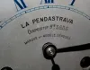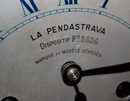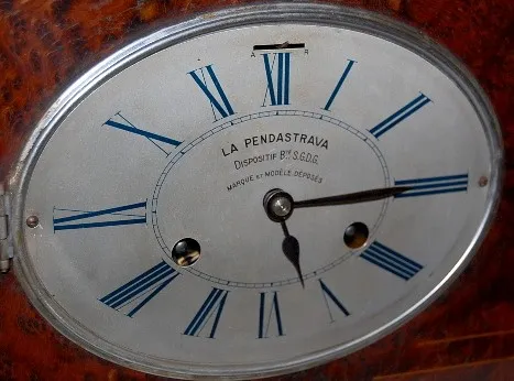 Inlaid wood case, time and strike; dial reads "LA PENDASTRAVA Dispositif Bte S.G.D.G." (Minor roughness to case.) 9" t x 14" w"