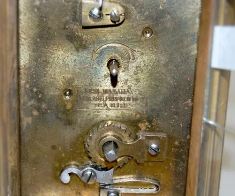 2 Antique French Carriage Clocks 1.) Marked "Made in France" on works; porcelain dial, beveled glass, 5 glass panels, no key, not tested. (Corrosion to inside of the back door.) 2.) Marked John Wanamaker Philadelphia, New York, Paris" on the works; porcelain dial marked France; 5 glass panels; no key; not tested. (Glass cracked across back door., wear to case.)