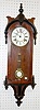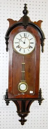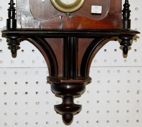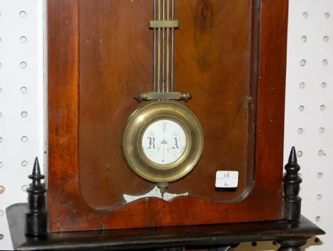 Antique German Wall Hanging R.A. Clock time and strike; has pendulum; 6 1/2" porcelain dial; two color case with teardrop side finials; not tested for running condition. (Dial damaged.) 36"
