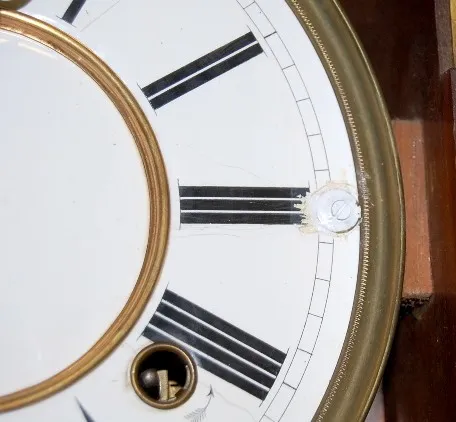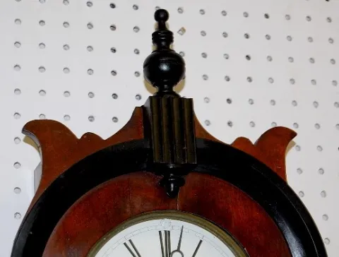 time and strike; has pendulum; 6 1/2" porcelain dial; two color case with teardrop side finials; not tested for running condition. (Dial damaged.) 36"