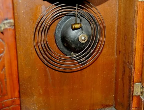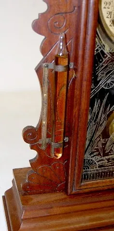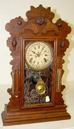 1.) Waterbury Walnut Mantle Clock: with applied flowers; 8 day; time and strike; 5" marked paper on tin dial; no key or pendulum; stork and cattail de...
