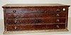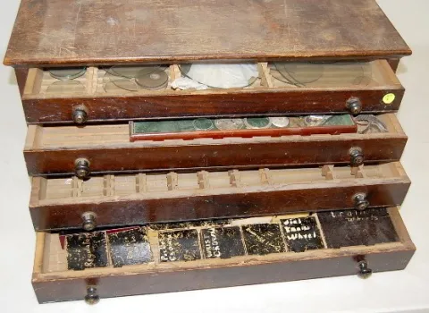 4 Drawer Oak Cabinet With Misc. Parts w/ clock crystals; train wheel parts. (Rough finish.) 10 x 25 1/2" x 14