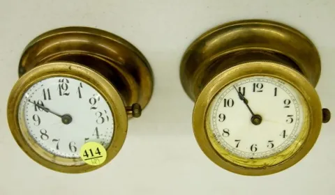 1.) Marked porcelain dial with beveled glass; key wind, S-F on the side. Not working. (Dial fractured.) 2.) Marked porcelain dial, key wind; S F on th...