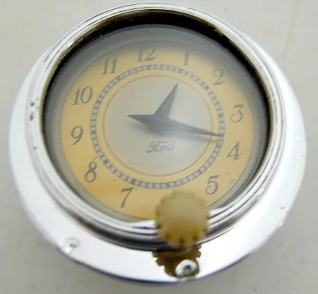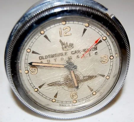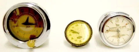 1.) Ford stem wind by Westclox; dash mount; w/ light bulb access. (No light bulb.) 2.) Swiss, Oldsmobile car-watch; automatic; gyro movement. 3.) Ford precision; 8 day; stem wind; dash mount. (Cracked dial.)