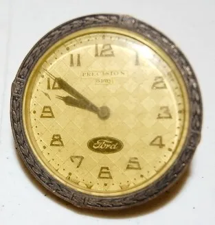 3 Car Clocks, Ford and Swiss Oldsmobile 1.) Ford stem wind by Westclox; dash mount; w/ light bulb access. (No light bulb.) 2.) Swiss, Oldsmobile car-watch; automatic; gyro movement. 3.) Ford precision; 8 day; stem wind; dash mount. (Cracked dial.)