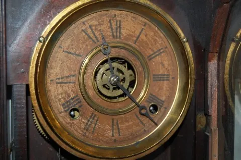 "Liberty" Hanging Kitchen Clock w/Alarm T and S; new finial. This lot is in rough, as is, as found condition.
