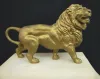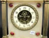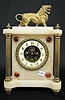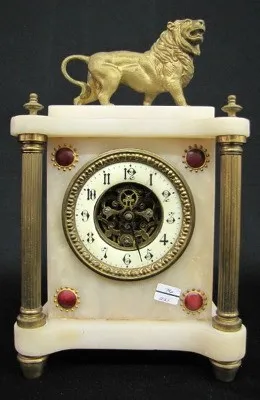 Antique French Alabaster Clock W/ Lion Figure porcelain chapter ring; open escapement; brass columns, finials and legs. (Chapter ring has hairline; minor expected chips.) 14"