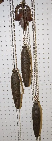 all carved wood with painted Roman numerals; 3 pine cone weights and grape leaf pendulum; movement marked G.H.S. (Top crest repaired; a brace on the double bird cuckoo.) 21" from crest to bottom of clock, not including pendulum