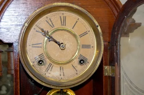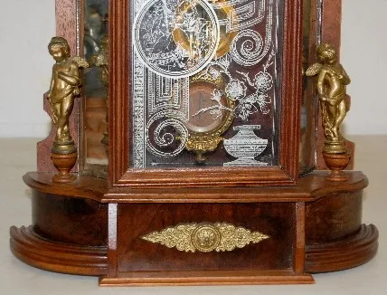Antique Walnut Mirrorside Parlor Clock w/ cherubs. (Stained dial.) This lot is in rough, as is, as found condition.