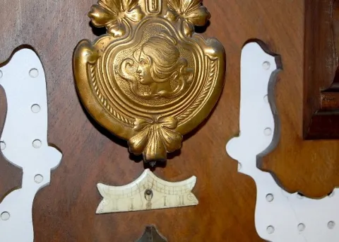 porcelain chapter ring; floral Art Nouveau dial and lady head pendulum. (Damaged beat scale; replaced top.) 34"...