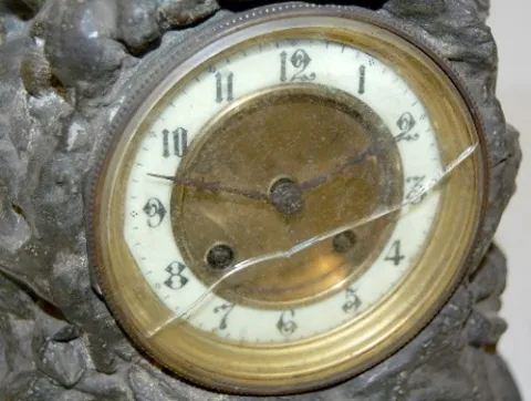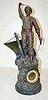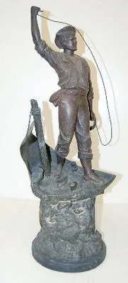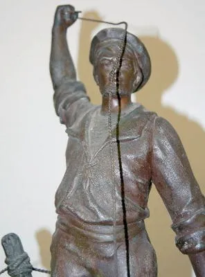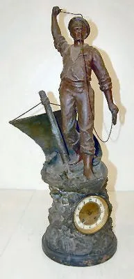 Antique French Statue Clock, Man in Boat porcelain dial. (Glass is cracked; title tag missing; rough patina.) 29 1/2"