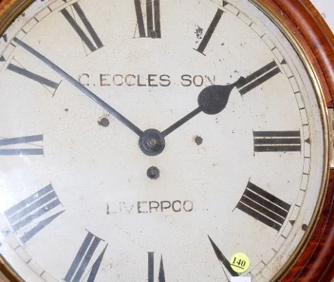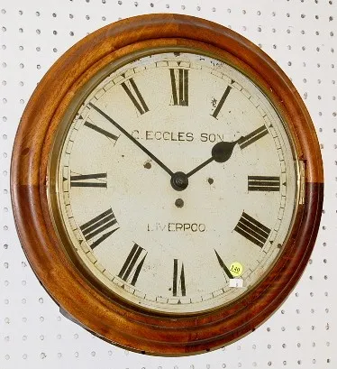 18" Liverpool Antique Fusee Gallery Clock Liverpool Antique Fusee Gallery Clock: C. Eccles Son Liverpool; time only; mahogany case; with pendulum. (Dial has losses.)