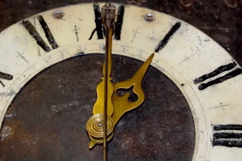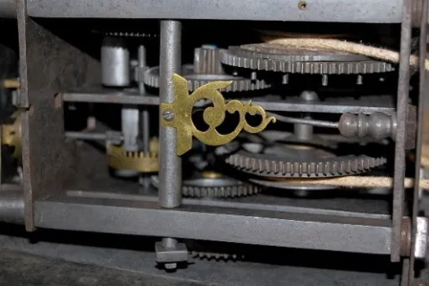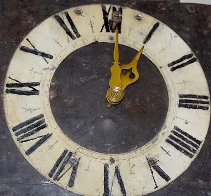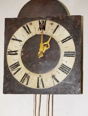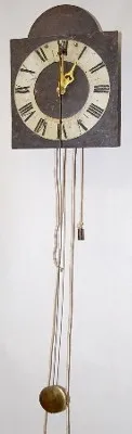 weight driven; cow tail pendulum; bell strike; two early iron weights. (Pendulum needs repair.)