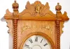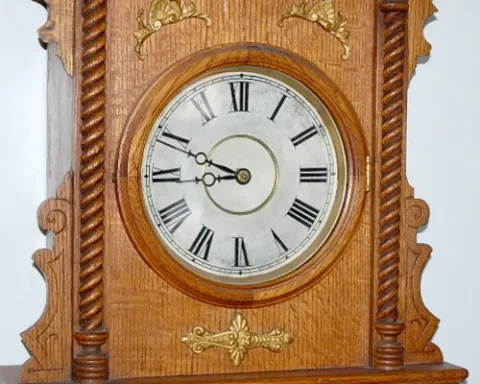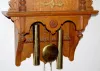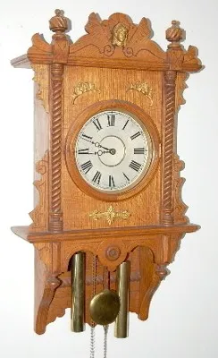 Antique Oak Study Wall Hanging Clock 2 brass weights; twisted columns; metal trim. 30"